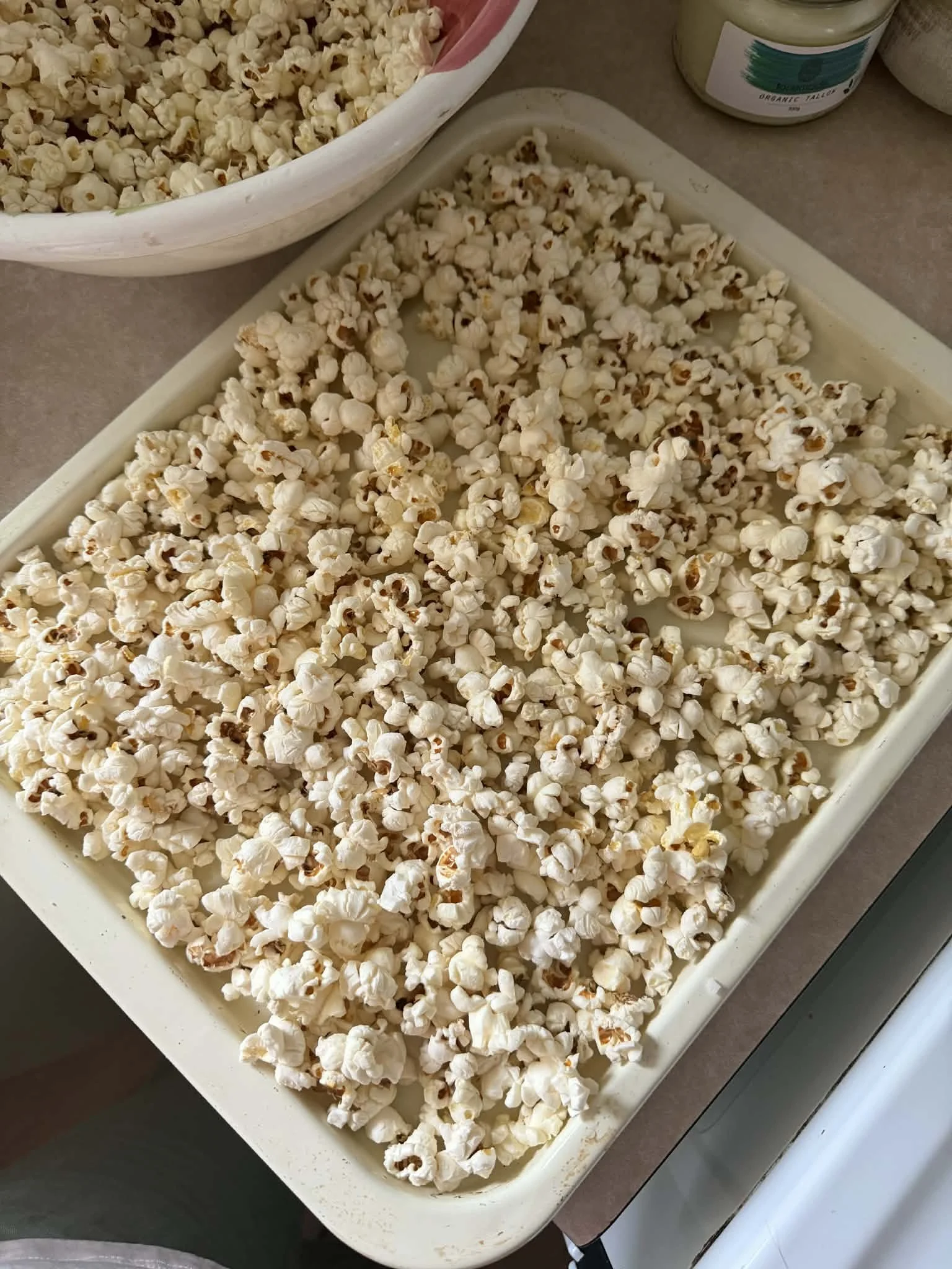Transfer the popcorn to a large tray or baking sheet and spread it out in a single layer. Sprinkle with sea salt while still warm and toss gently to coat.